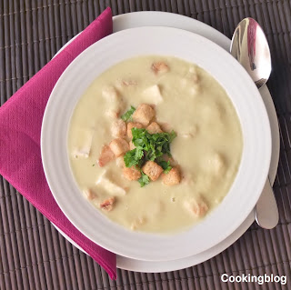 - Na altura de servir, colocar em cada prato uma parte de sopa bem quente, um pouco de salsa picada e os cubos de maçã e pão.