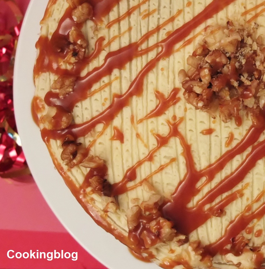 - Para montar o bolo, colocar no prato a primeira camada, barrar com um pouco de caramelo e 1/3 das nozes. Barrar então com o creme de merengue. Repetir esta operação com as outras duas camadas. Barrar a superfície e as laterias do bolo com o restante creme. Colocar as nozes e decorar a gosto com o creme de caramelo.