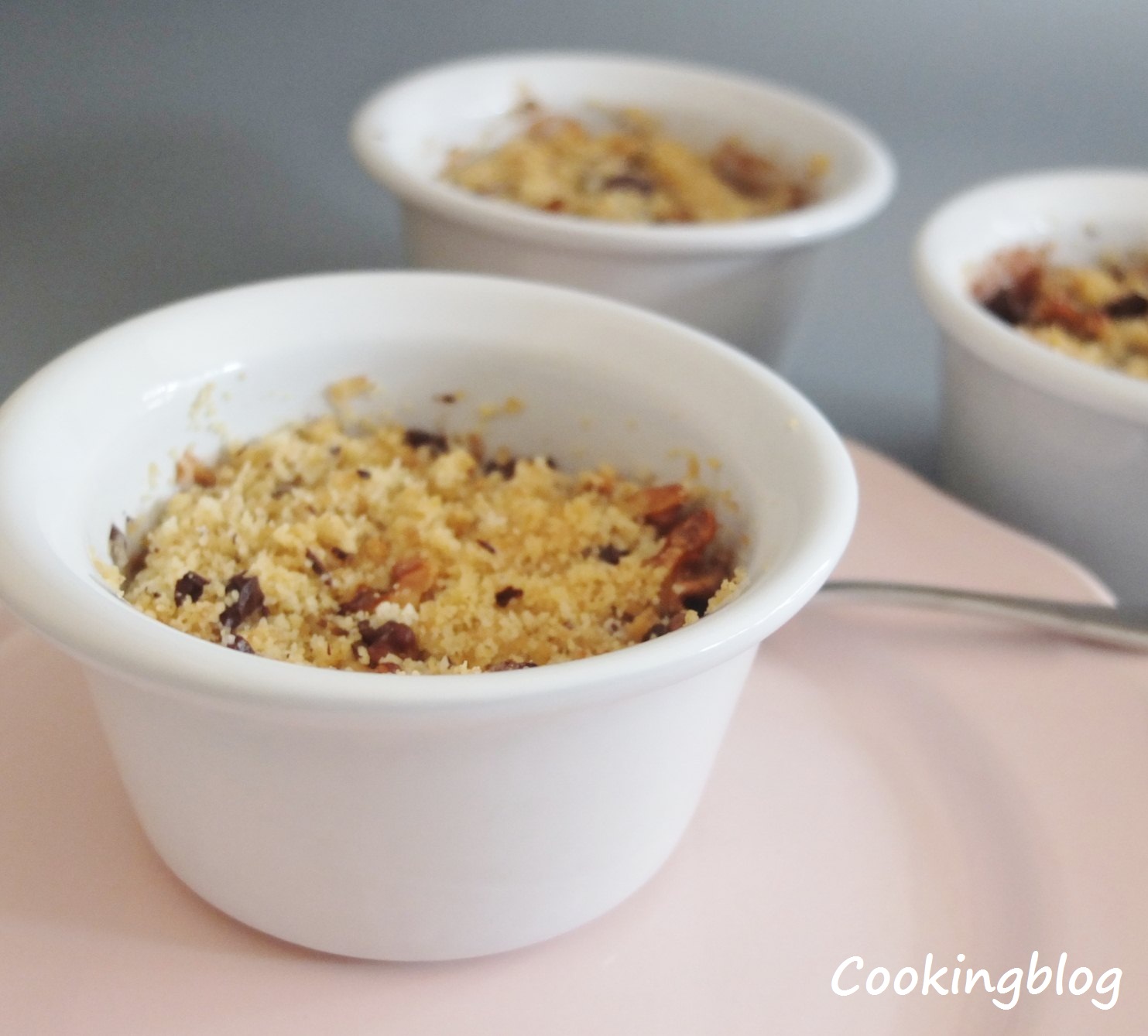 Preparar o crumble: numa taça trabalhar com as pontas dos dedos a farinha e a manteiga até obter uma mistura granulada. Adicionar o açúcar, o chocolate e as nozes.